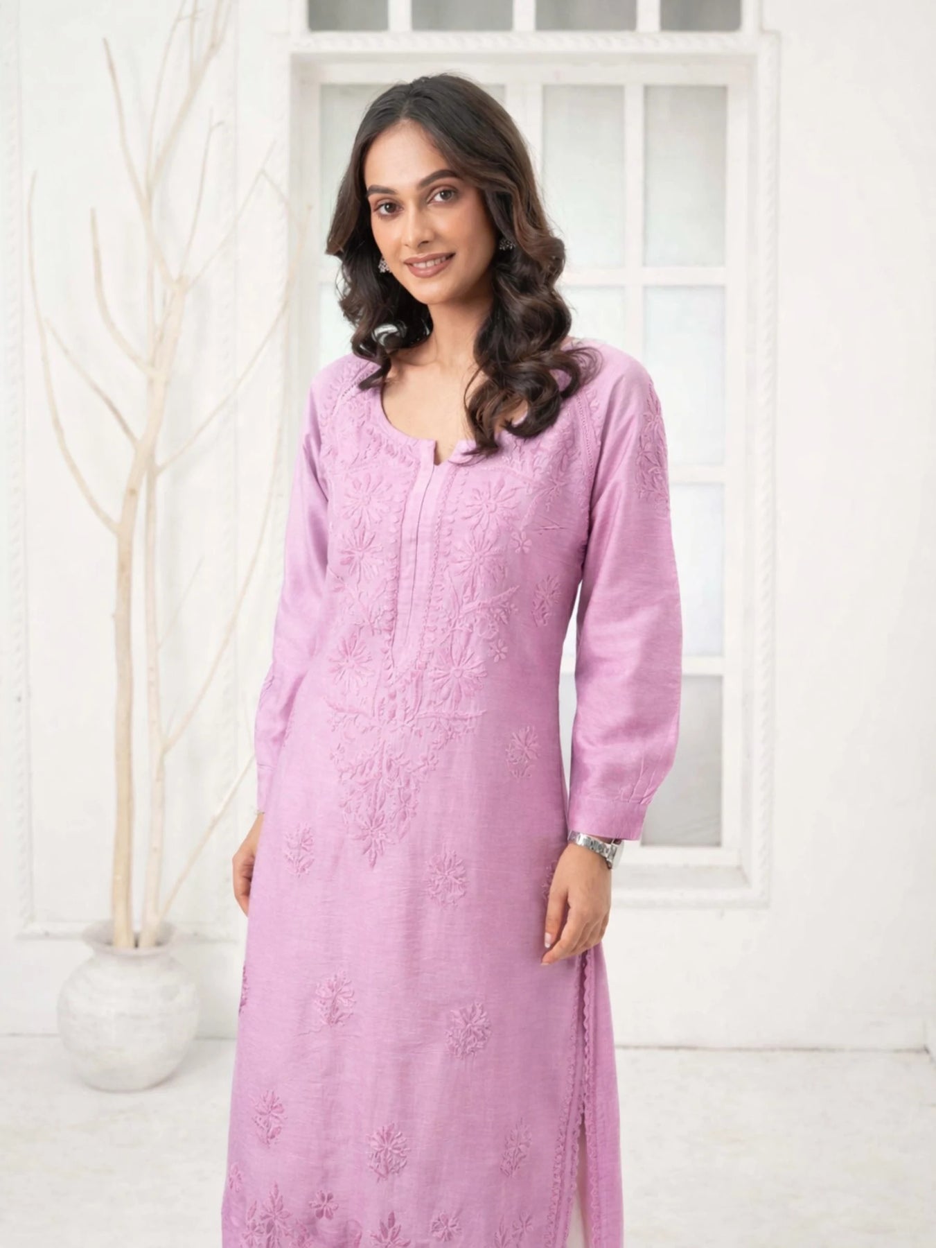 Bring a touch of classic sophistication to your wardrobe with our Roshni Purple Chanderi Kurta from Kaari Katha. Meticulously handcrafted by skilled artisans, this kurta features all-over chikankari embroidery on the front, back, and sleeves. The airy chanderi fabric delivers comfort with a hint of luxury, making it perfect for festive moments or polished everyday looks. A true celebration of traditional artistry in a contemporary palette.